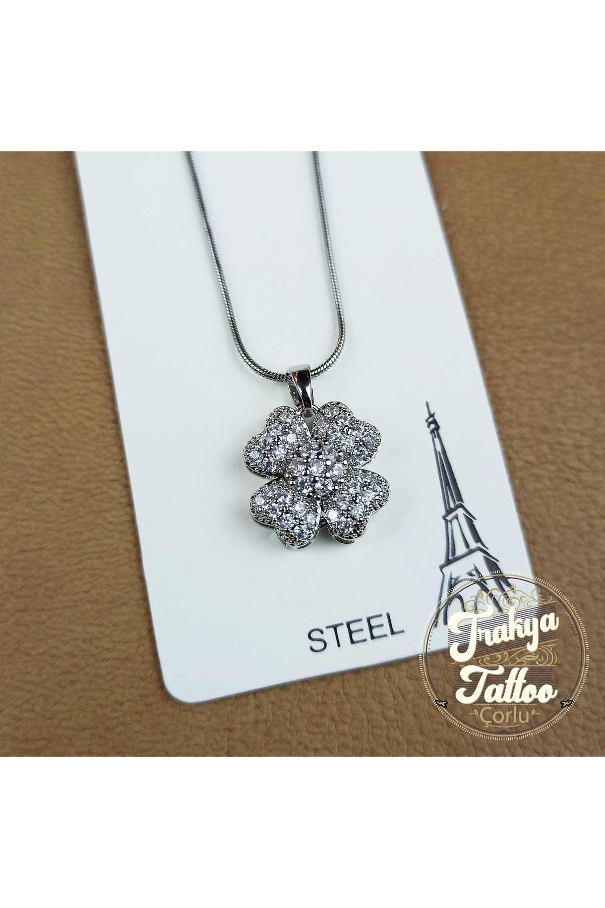 Yonca Figürlü Taşlı Çelik Kolye