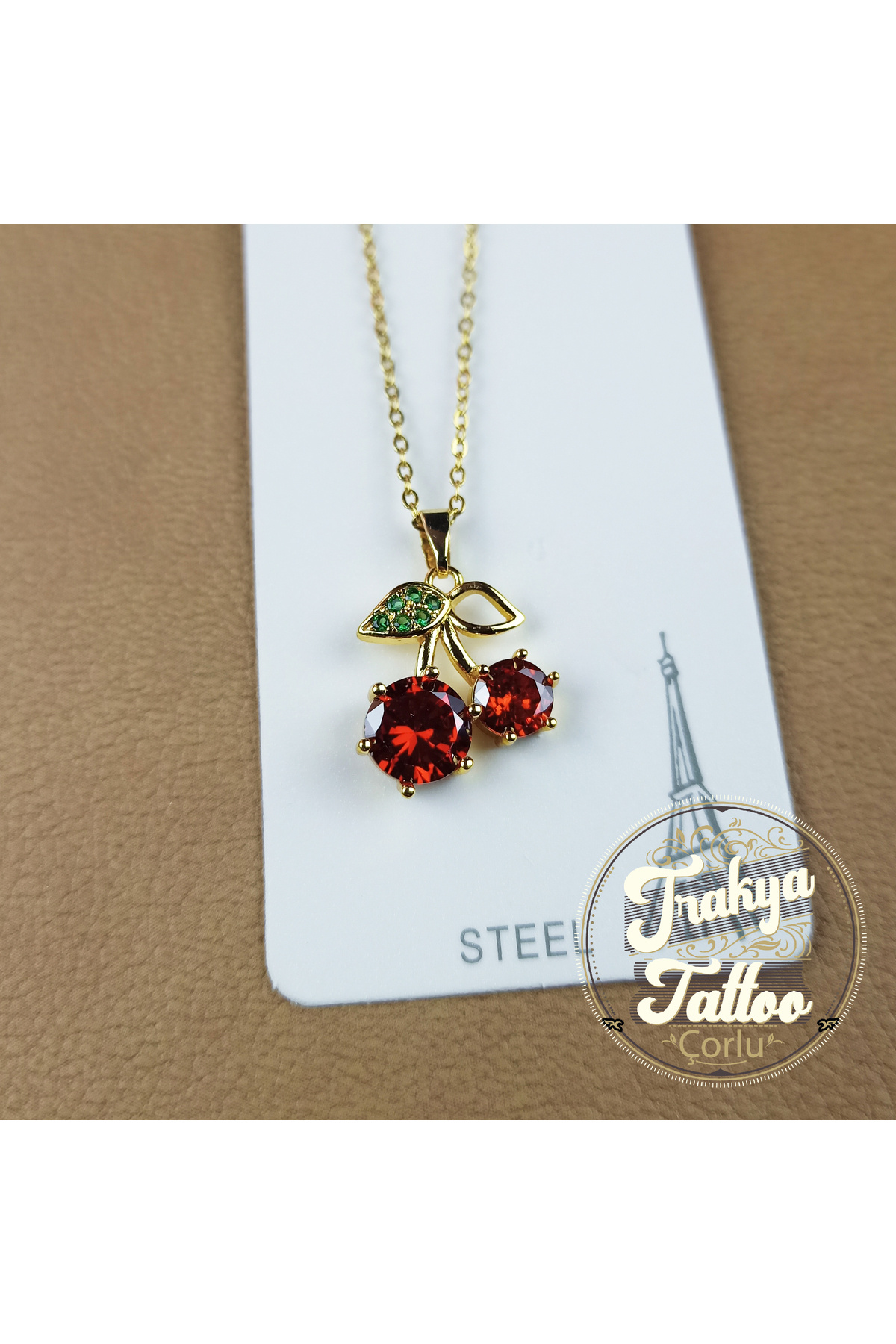 Kiraz Motifli Altın Rengi Çelik Kolye