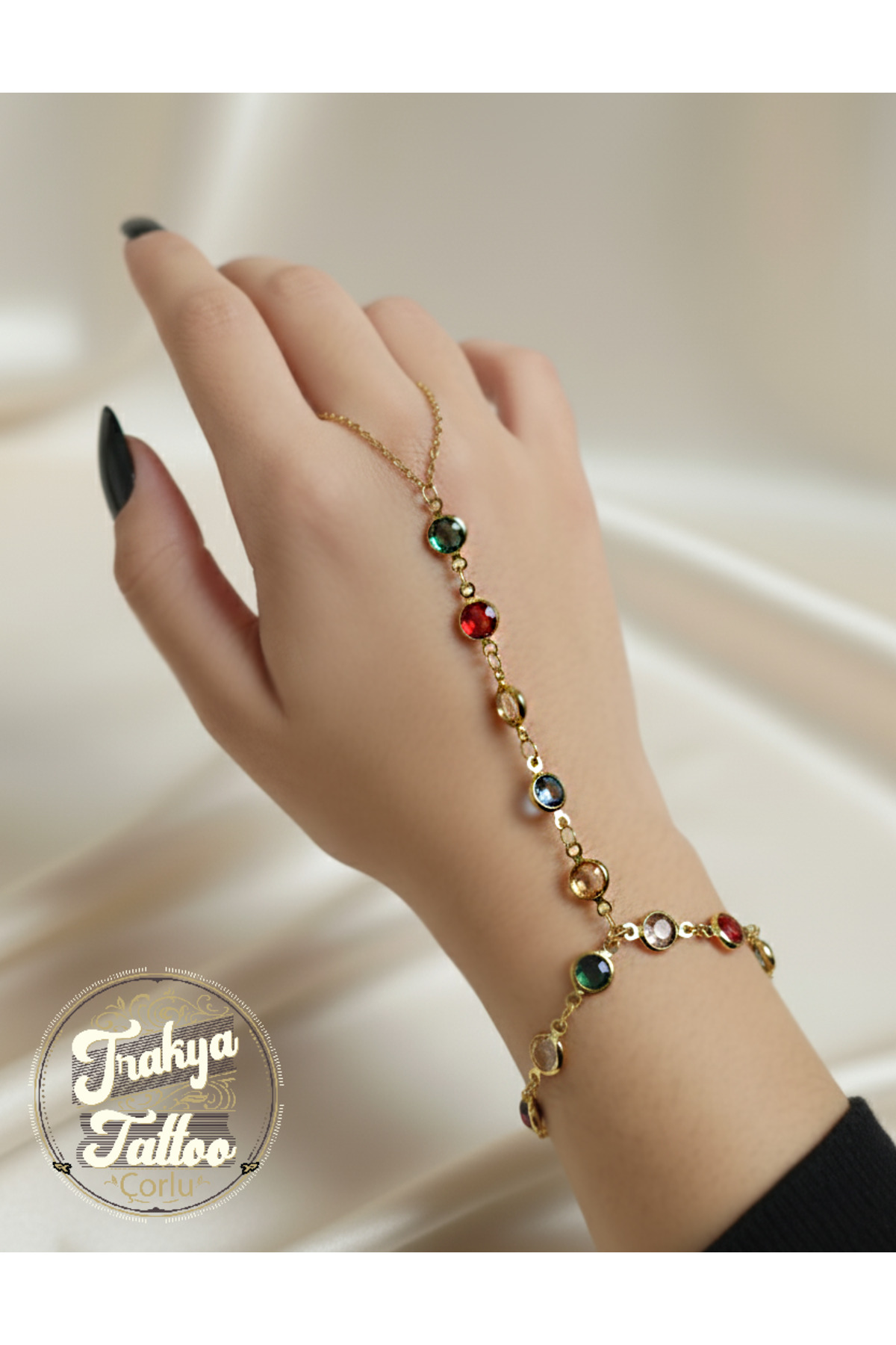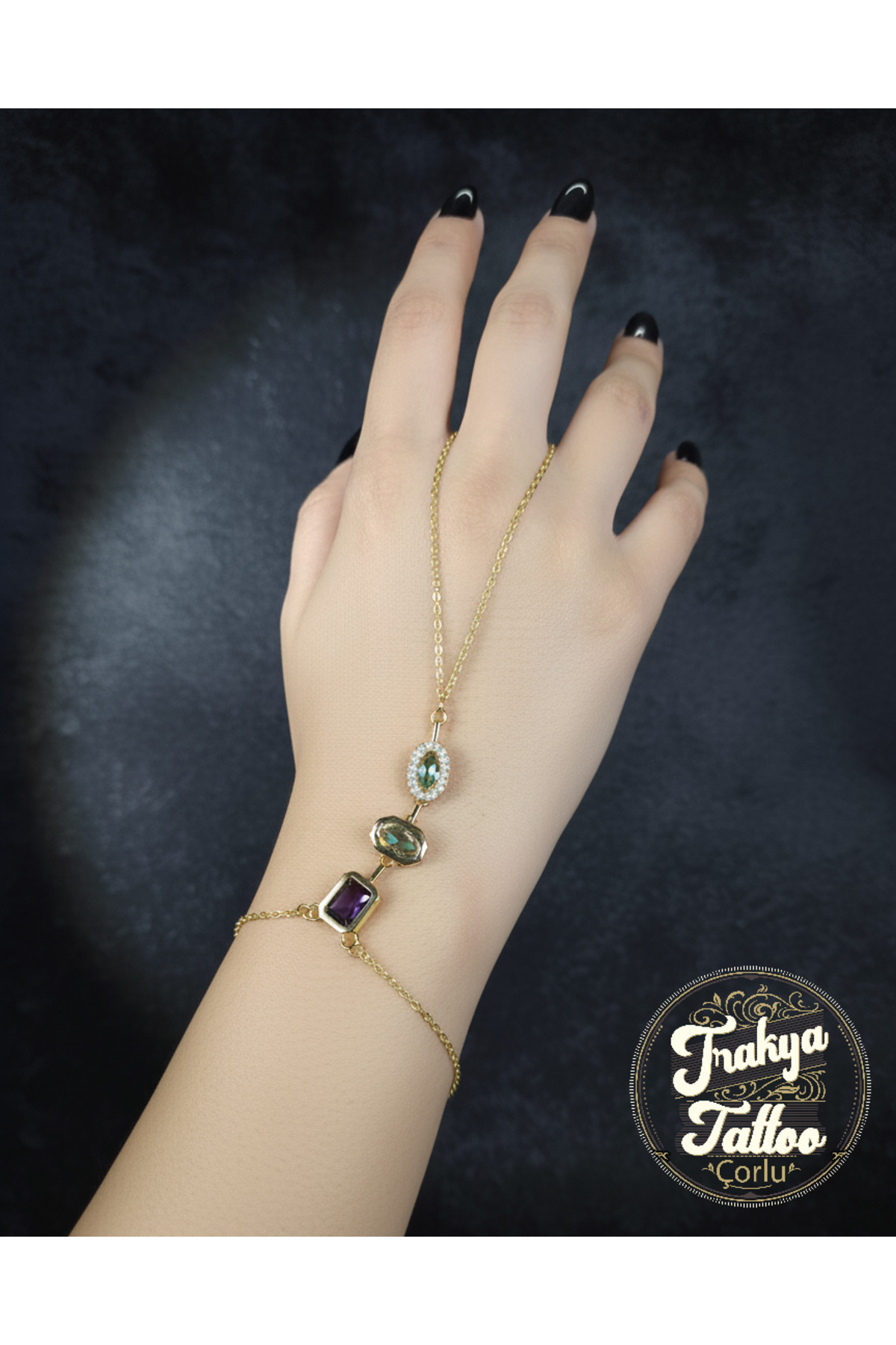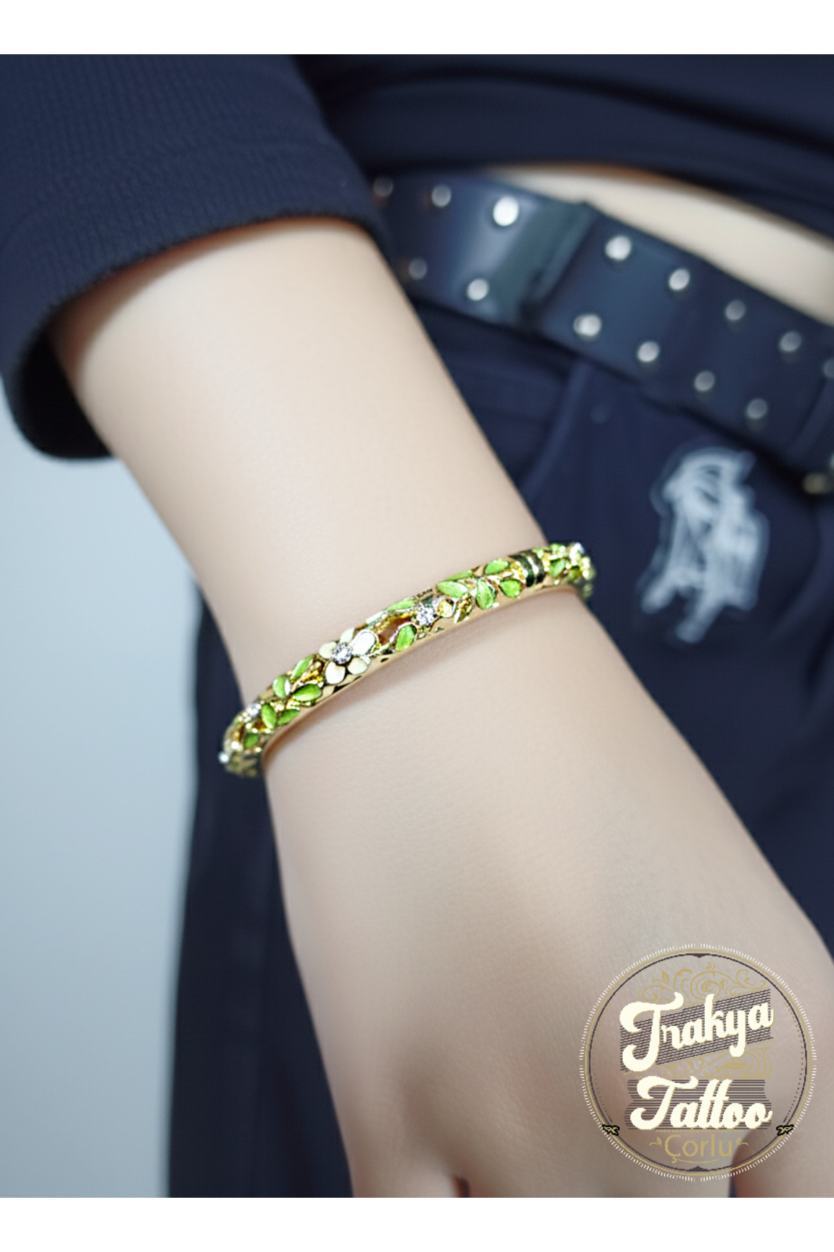 Mineli ve Taşlı Motifli Çelik Bileklik Gold Yeşil Krem Renk Taşlı