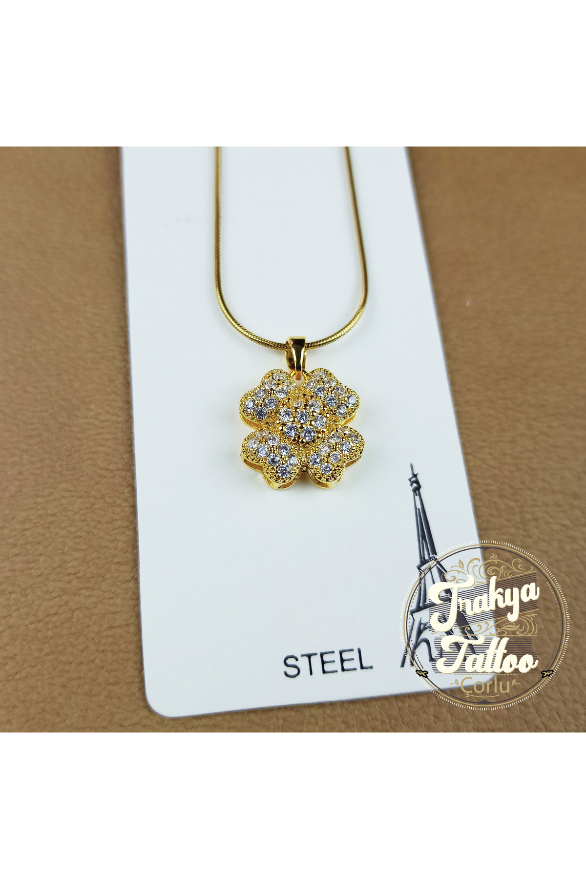 Yonca Motifli Altın Rengi Çelik Kolye