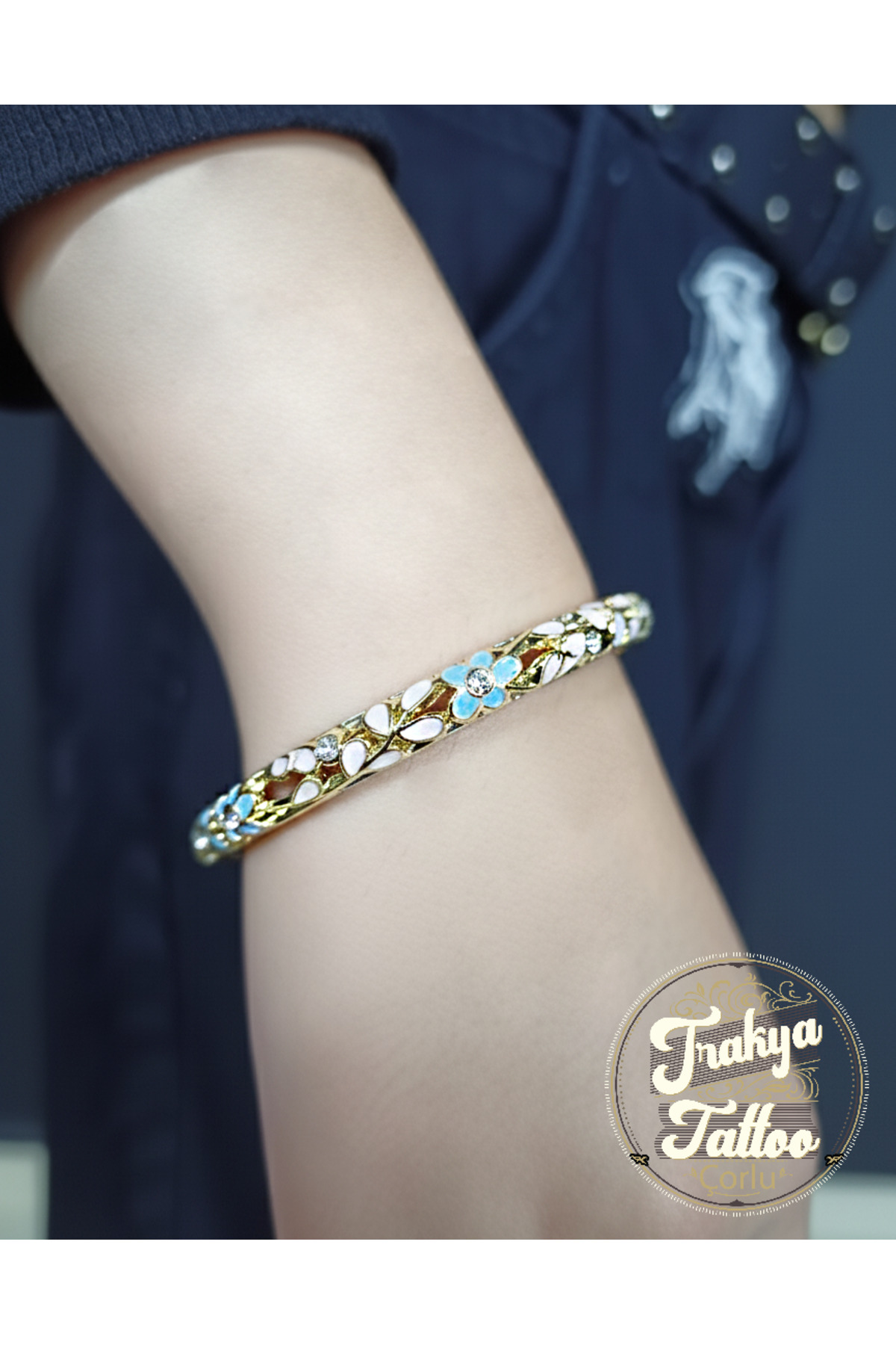 Mineli ve Taşlı Motifli Çelik Bileklik Gold Mavi Krem Renk Taşlı