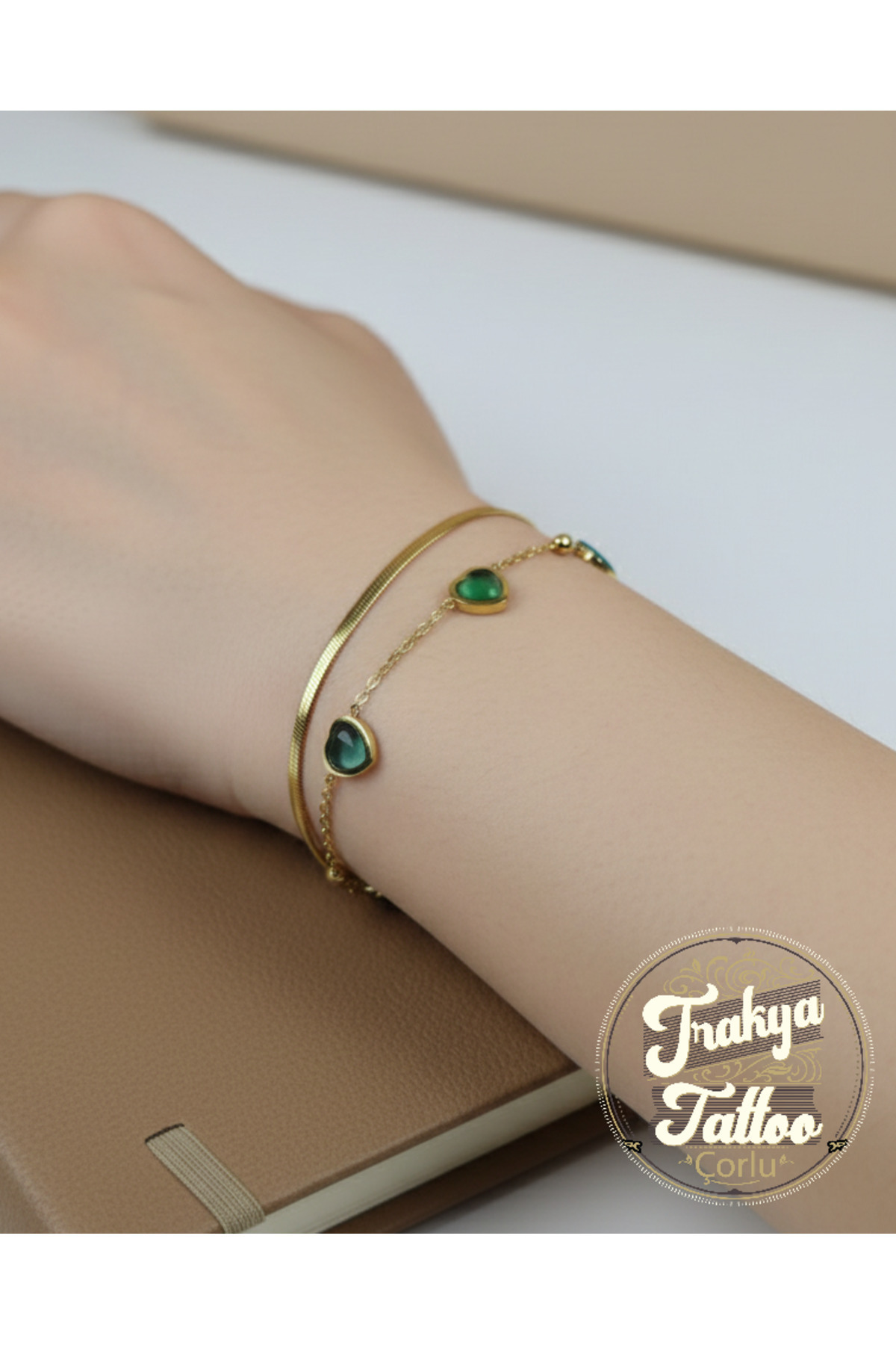 Altın Renkli Zümrüt Kalp Taş Detaylı Çelik Bileklik